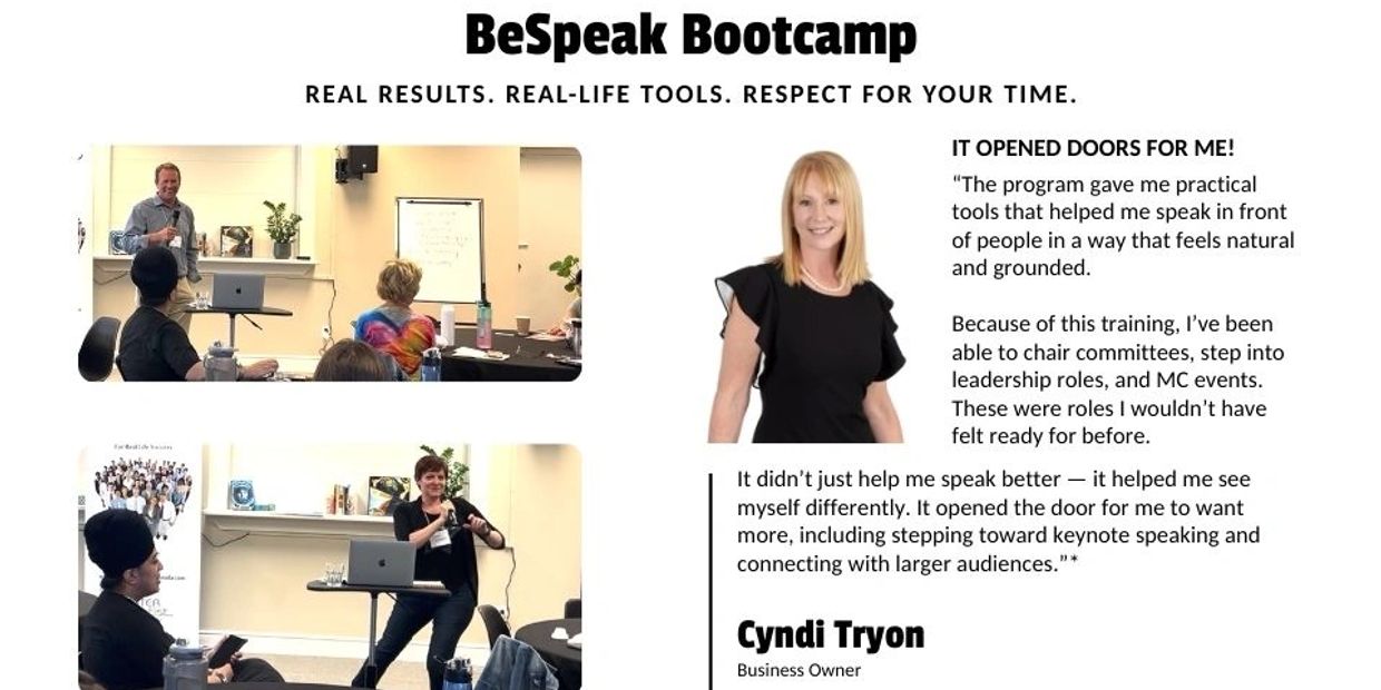 BeSpeak Bootcamp is a hands-on learning experience for business people who want to communicate with more confidence, clarity, connection, and influence — without overthinking, freezing, or feeling pressured.